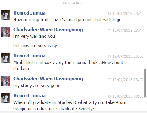 say about my education and he asks me about graduate. After that I say I am very serious because research’s problem, I say it is very difficult. Then he gives a spirit and sends a funny picture to me.